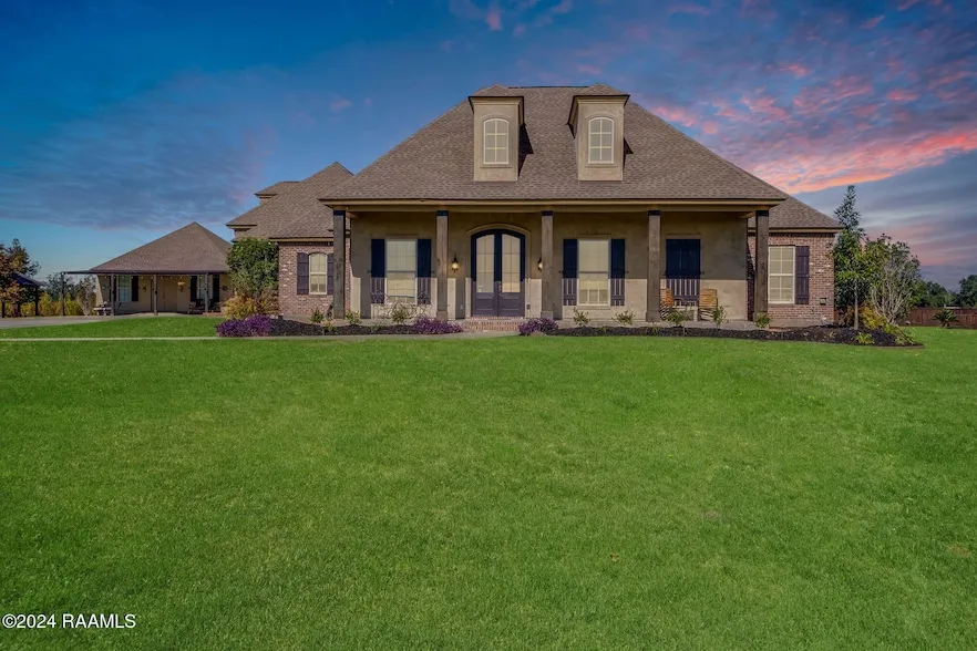 Welcome to a truly unique retreat in the rapidly growing city of Scott! Nestled on over 5 pristine acres, this gated 4-bedroom, 2.5-bath home offers both space and serenity. Step inside to an open-concept kitchen and living area that's perfect for entertaining. The chef's kitchen is truly the heart of the home, featuring 3cm granite countertops, a spacious island with seating and storage, and a large walk-in pantry. Thoughtful design details make this space as beautiful as it is functional.The living room features a cozy fireplace framed by custom built-ins, ideal for displaying your treasures. The primary suite is a serene retreat, complete with a large soaker tub, separate shower, dual vanities, and a dedicated makeup vanity. Nearby, a private office is perfectly situated for working from home. On the other side, you'll find two spacious guest bedrooms and a full bathroom, providing privacy and comfort for family or visitors. Upstairs, a bonus room with an additional bedroom makes a great guest suite, playroom, or media room. This home has abundant storage options throughout, you'll have space for everything! Outside through the dining room door, step into your own personal private oasis-An inviting inground pool complete with fountains, ideal for cooling off in Louisiana's warmer months. The covered outdoor kitchen area will get lots of use! Adding to the entertainment options, a separate building currently set up as a game room--with its own half bath--offers versatility and potential to transform into an apartment or an outdoor kitchen, adding convenience and charm for gatherings. Enjoy two large ponds stocked with bass and bream, perfect for peaceful mornings or afternoons spent fishing. There's also a large storage workshop adding more to your storage options! Neutral color palette throughout home. This property truly provides the best of both worlds: a private retreat with breathtaking sunsets!