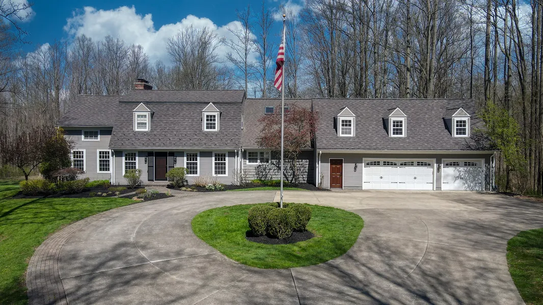 Sitting on 5 wooded acres, this beautiful and sprawling Country Cape Cod Colonial has been meticulously maintained and cared for. The entry opens into a light filled living room with windows to the exterior, wood burning fireplace and crown molding throughout. The private office with built in shelving and additional fireplace is the perfect work at home option and opens into the bright eat-in kitchen with large windows. The kitchen includes a large center island, deep farmhouse sink and stainless steel appliances. For more entertaining options, the formal dining room is the perfect area for gathering, along with the four season porch with incredible views of the exterior. A first floor laundry and separate mud room entrance complete this fabulous main floor. The upper level includes four bedrooms and large office/recreational space. The owner's suite includes exceptional beamed ceiling a...
