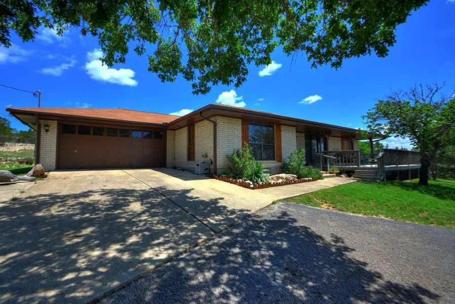 This home sits high on a hill w/panoramic views of the surrounding Texas Hill Country valley. Generous front deck allows for multiple seating to take it all in. Open concept living/dining rooms w/wood burning fireplace & tile flooring. Sizable den for sitting around the fireplace or watching the family's favorite movie. Kitchen offers eating bar, stained wood cabinetry, island, & breakfast area. Private master suite feature sitting area & nicely appointed full bath w/built-ins. 2-guest bedrooms & bath. Detached expansive (30x30) workshop, constructed in 2009, offers many possibilities for hobbies, wood working, crafts, etc. w/covered & open air deck. Attic space is finished apartment w/reclaimed long leaf Pine floors. Updated HVAC & water pump in 2011/new water heater in 2012.