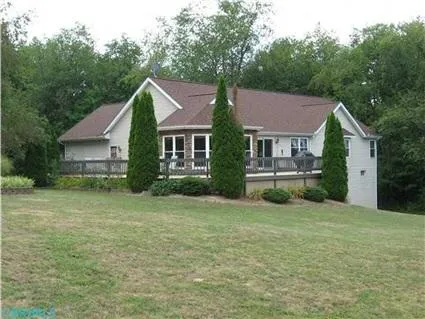 There are beautiful views from every window in this thoughtfully-designed and well-built home tucked back behind a rise on 6.4 acres of land. Beautiful natural light accents the angles of the cathedral ceiling and fills almost every corner of this home. The great room transitions to an eating area surrounded by windows. The kitchen has granite countertops, abundant oak cabinetry, and lots of pantry storage. The owners bedroom suite is on this main level, as are two more bedrooms and a full hall bath. The first floor laundry has a guest bath as well. A large deck surrounds the dining area, providing an excellent setting for entertaining. Upstairs and overlooking the great room is a loft spacegreat for office or crafts