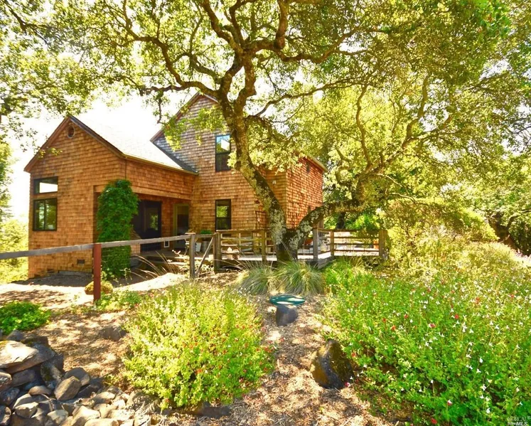 A meandering drive through a wide meadow leads to this charming home and enchanting,updated guest house.All nestled on 5+ Oak studded acres. The attractive home features vaulted ceilings,large picture windows,wood floors,raised hearth fireplace,remodeled kitchen with marble counters and maple cabinets.The light filled Great room opens to the kitchen,den/office and dining area overlooking the in ground pool, forest and canyon. Wonderful outdoor entertaining areas with generous spacious decks enhance the wine country lifestyle.Rock lined paths leads to the stylish guest house with vaulted ceiling,raised hearth fireplace,open floor plan and walls of glass,framing the forest and meadow. Wraparound decks provide inviting areas to entertain or for quiet reflection of the surrounding natural beauty. This special and peaceful oasis is only minutes from Sonoma's historic Plaza,shops,fine dining a...