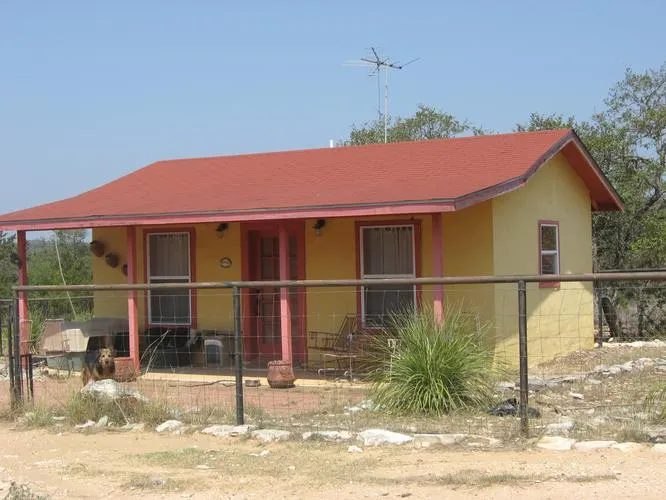 5 acres fully fenced with high quality pipe fencing. Home is made of concrete block construction finished with stucco. There is no septic, but does have water and electricity. Several animal pens in place. Great area for goats, lamas, horses. Deck remains where above ground pool was removed. Home is efficiency style with Spanish theme--your own little La Casita! Property is on high ground.