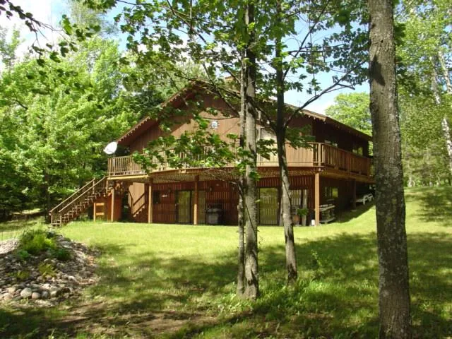 Extraordinary opportunity to own a luxury 3 bedroom home with 2900 sq.ft. living area, 2 fireplaces, finished walk-out lower level, lakeside deck and patio: AND an additional 3 bedroom, 2 story guest home for family and friends! As if that's not enough -- it includes 200' sandy shoreline on beautiful Crystal Lake and 5.5 wooded acres, a redwood enclosed spa/hot tub, cedar lined sauna and screen house.