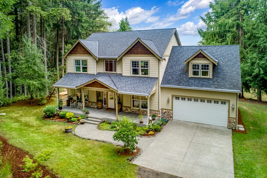 Welcome home to your 5.5 acre private country estate with spectacular views of Puget Sound and the Cascade Mountains! This 2007 custom built home features 4 bedrooms and nearly 3000 sq ft of beautifully appointed interior space and a wonderful open floor plan. Chef's kitchen is perfect for entertaining w/ immediate access to a spacious VIEW deck that leads towards a large firepit area and covered hot tub! All 4 bedrooms are up including the luxurious primary suite w/ vaulted ceilings, gorgeous 5 piece bath, walk-in-closet, and stunning views! The additional bedrooms are spacious and share a lovely full bath. Huge bonus room above the garage, too! The grounds offer lots of room for play (perhaps horses?), and terrific mini farm potential!