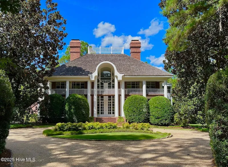 Experience the perfect blend of luxury and privacy in this gorgeous, unique, contemporary home on 5+acres in the Country Club of North Carolina designed by renowned NC modernist architect James Howard Fox. Step into a grand entrance foyer that welcomes you into a thoughtfully designed interior featuring soaring ceilings, elegant architectural details, and an abundance of natural light. The thoughtfully designed main level offers a seamless flow between formal and casual living spaces, including a gracious living room, cozy sitting room, expansive family room overlooking the pool, and an eat-in kitchen, perfect for both everyday living and entertaining. Upstairs, you'll find all bedrooms privately situated, offering comfort and tranquility. Enjoy cozy evenings by one of six fireplaces throughout the home where warmth and ambiance are always close at hand. Step outside to your private oasis featuring a sparkling in-ground pool with hot tub, a charming vine-covered pergola, and a second-floor balcony offering breathtaking views of the property. Whether you're lounging by the pool or hosting under the stars, this home is a true retreat. This one-of-a-kind property combines architectural elegance with exceptional outdoor amenities -- a rare find!