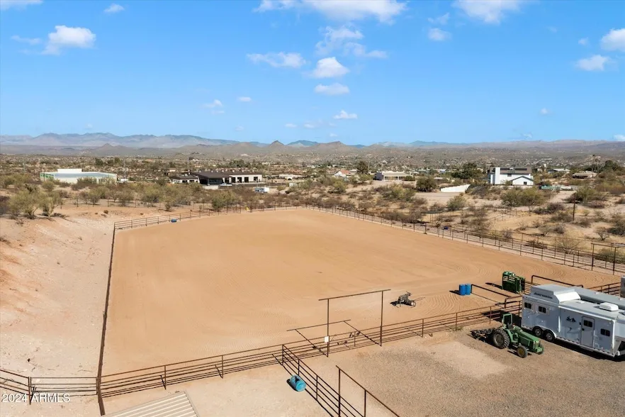MOTIVATED Seller!!! own slice of roper's paradise! This stunning property blends the best of luxury living with a top-of-the-line roping facility, all set against breathtaking views. Step inside this beautifully updated Santa Fe-style home, where charm and comfort harmonize perfectly. Rock fireplace creates a warm and inviting centerpiece for cozy nights. In the kitchen the gorgeous granite countertops, updated refrigerator, and many cabinets add sophistication and practicality. The Spanish style tile floors and wood accents & rock wall are finishes that showcase the exceptional craftsmanship of the home. The numerous entertainment spaces are perfect for hosting family and friends. The courtyard entrance and gate provide a stunning welcome with extensive landscaping, mature plant and trees with true Southwestern charm. Enjoy the Arizona sunsets, relax and unwind in your private heated pool. Ropers will love the professional arena equipped with sprinklers, roping chute and return alley. There is also a large turnout, steer pen, and 7 pens with covers misters and automatic waterers. There is a hay barn and tack room with a covered tie rack that will fit all your storage needs. For visitors there are two full RV hookups that will make hosting friends and family a breeze. The property is also fenced with steel pipe and no climb. This extraordinary property offers the ultimate balance of luxury living and equestrian excellence. Whether you're a professional roper, a weekend cowboy, or simply someone who appreciates the Western lifestyle, this is the place where dreams become reality. Come and experience firsthand why this roper's dream is truly one of a kind!
