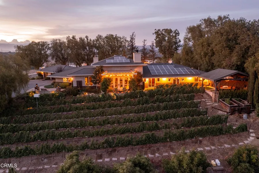 Spectacular View Vineyard Estate In the far North East end of the City of Thousand Oaks. Set on a promontory behind a private gate, this one-of-a-kind architectural masterpiece offers stunning panoramic views, extraordinary craftsmanship, and a stylistic confluence of modernity and sophistication that redefines all expectations. An open floor plan and broad French doors seamlessly integrate indoor/outdoor spaces for entertainment and relaxation. Nothing else compares to this breathtaking one of a kind estate. One story residence spans over 4,000' providing complete privacy and seclusion, boasting amenities which include 5 bedrooms of which there are two 2 potential primary en-suite bedrooms (one with a sitting area, a fireplace; other with built-in Murphy queen bed), 4 bathrooms all remodeled in 2016 with custom tile, granite and slate flooring. Master Bath, Hallway Bath and Guest Room Bath all have radiant heated floors with timers and schedule setting. Richly hued gleaming engineered wood flooring. The Great Room showcases views both north and south to the surrounding hills and farms. This estate was designed and remodeled with magnificent character and the very finest finishes and craftsmanship. Kitchen off the Great Room has a large island, granite counters and custom cabinets. Kitchen appliances include KitchenAid side-by-side, built-in refrigerator/freezer; DCS six burner gas range; KitchenAid in-wall electric dual conventional/convection oven; KitchenAid microwave oven; KitchenAid warming drawer; KitchenAid dishwasher. Owned (no lease or loan) solar system. Insulated 500-plus bottle wine cellar with VinoTemp temperature and humidity control. Custom cabinetry and stonework. With premier locations on the property there is a 4-acre orchard of GAP-certified Hass avocados (approximately 536 trees and a 1/2-acre vineyard of Cabernet Sauvignon grapes (approximately 188 vines). Both the current and prior owner used the grapes to create Cabernet Sauvignon wine. The grounds, property and setting are second to none. In the rear yard there is a Saltwater swimming pool & spa complete with Waterfall feature and spa spillover controlled by remote or cellular app controlled iAquaLink system, and a custom built pizza oven .There are panoramic unobstructed views from everywhere. One of California's absolute finest properties!Two recorded parcels, second parcel number is: 592-0-101-185