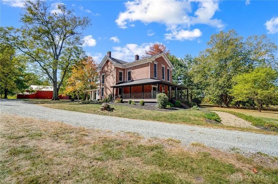 Historic old-world charm with modern updates & upgrades throughout. Featuring an array of amenities too numerous to list. Here are some favorites: Gated entrance with secluded, private breathtaking setting on nearly 6 acres surrounded by mature trees. Property is situated down a long private driveway barely visible from the road with turn around driveway. Professionally maintained pond features fountain & is stocked with bass fish. Large barn for horses has 4 stalls, tack room & overhead loft for hay. 3 or 4 car-deep tandem garage in sqft with a 2-car overhead door. Built in 1834, this stately brick historic home has a covered walk around deck. Though originally built in 1834 it was expanded in the 1860's & 2015 to include extensive modern updates & upgrades. Today it features 4 bedrooms, 3.5 baths, newer main level master suite with large walk-in closet, cathedral ceiling & modern bath. In addition to the covered wrap around porch there is a decent sized patio for outdoor entertaining. Kitchen features hardwood maple cabinets & farmhouse sink which opens to the dining room. First floor living room or home office has floor to ceiling windows, American chestnut wood floors & a fireplace. The recent great room addition boasts cathedral ceiling, ample windows, exposed brick, & access to 1/2 bath & patio entertaining. Fully equipped kitchen with stainless steel appliances including disposal, dishwasher, double over/range, refrigerator & microwave. Brick accent wall in kitchen as well as wood floors & pantry. Second level with 3 bedrooms or 2 bedrooms and a second study. Partial unfinished basement for ample storage. 2 utility rooms; one up and one down with a stack washer & dryer. 2nd mas. br & bath on 2nd floor. Backs to Caesars Creek Lake, walking & riding trails. PRICED 200,000 BELOW APPRAISAL ON 9-11-24 WHICH SELLER ORDERED. Must see to appreciate. Good value... compare. *photos are digitally stage * room sizes are approximate