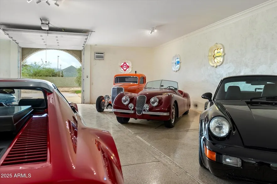 It's FINALLY here! The ultimate garage home! One Bedroom and 3 Garage Buildings (over 6,000sf of garages) to display over 30 cars without lifts. This home, sitting on over 6 total acres, is just 4 minutes from downtown Cave Creek and your horses are welcome too. You'll have everything that you need and the space to put everything that you want! Just add a car collection and some friends. The home is simple and classy, with a huge window looking at your toys in the garage. The main garage has a warm bar / social area with TV and large back bar for servicing your garage events. Garage #2 is wide open and tall if you want lifts. It has a room for parts and tools to keep your space tidy. Garage #3 is the working garage, for dirty jobs and heavy equipment. This home is discreet and secure.