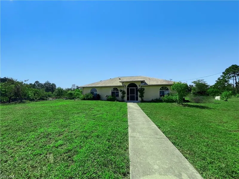 Panoramic Land and Canal views from this Private Off-the-Grid living 5.61 Acre Single Family Home. Spacious, Light and Bright with 1992SF of living space and a slider enclosed Lanai facing south. Last Home on the street, cul-de-sac with wide canal frontage. Five-bedrooms plus a den, Three full baths with no carpet and tile throughout. This Home features include, not in a Flood zone, Whole House Reverse Osmosis water system, 4K Video System with 16 camera's, Alarm system and a 10 Kilo-Watt Solar System (43 roof panels) all in working order. 5.61 Acres, all undercut, with 20 plus Premium Named Mango Fruit Trees, and Many other Sub-Tropical Fruit Trees planted around the acreage including 15 varieties of Banana Trees, with a Sprinkler system to service all. This Property is fenced in on three sides, including a chain link fence facing road. Home sold As-Is!