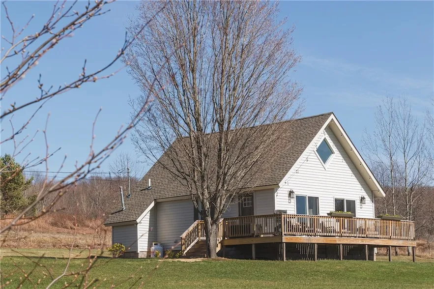 Watch the sun set every evening from this sweet updated chalet overlooking the Western Catskills. If you are a horse enthusiast or on the lookout for an amazing outbuilding, there is a beautiful new three-stall horse barn with electric and water that can also be easily reimagined as a studio, gym or garage. The lovingly renovated house has a classic chalet layout with cathedral ceilings, open kitchen and living/dining room, cozy pellet stove, and two glass sliders facing sweeping mountain views to the west. Two bedrooms (one with a washer and dryer) and a renovated bathroom round out this floor. Upstairs is the spacious loft - currently set up with a bed - which offers more room for an office or living space. This home has had extensive renovations including the addition of new siding, a deck, Anderson windows, doors, flooring, roof, well tank, hot water heater and a mini-split with AC. ...