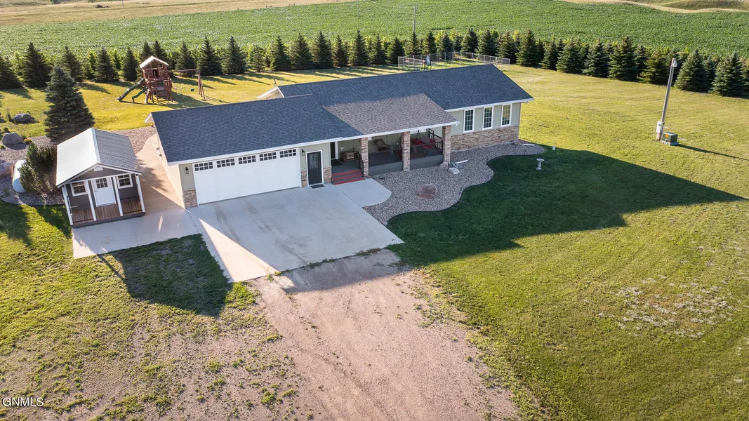 OUTSTANDING VIEWS & COUNTRY LIVING on nearly 6 ACRES only minutes from city convenience. Surrounded by maturing trees this rural property will surely be your everyday retreat with its never ending views, expansive maintenance-free deck, grand patio space, plus a designated fire pit area. Quality ranch-style home ideal for entertaining or relaxing while taking in the natural beauty found all around you. 3,280 total sq. ft featuring an incredible dining room filled with wall to wall windows, spacious kitchen with plenty of cabinet/counter space, eat-at center island, new stainless appliances, and pantry. Cozy living room with walk-out to back deck boasting beautiful morning views. Cleverly located main floor laundry with adjoining 3/4 bath make chores/cleanup a breeze. Primary bed and bath with walk-in closet as well as a generous office space/guest room complete the main floor. Downstairs you will find an additional three bedrooms, comfortable size family room, and full bathroom with quartz topped dual vanity. Basement storage and an oversized two-stall garage give you ample space for everything you need. If that was not enough there is also a 12'x24' ranch style shed with a covered porch (guest house, workshop, storage), a 12'X32' ''garage shed'' used to protect your lawn mowers, small tractors, ATVs, or even small vehicles from the harsh winter weather, and RV parking. Located a short three miles from town, this property is an excellent choice to call home. Call Today!