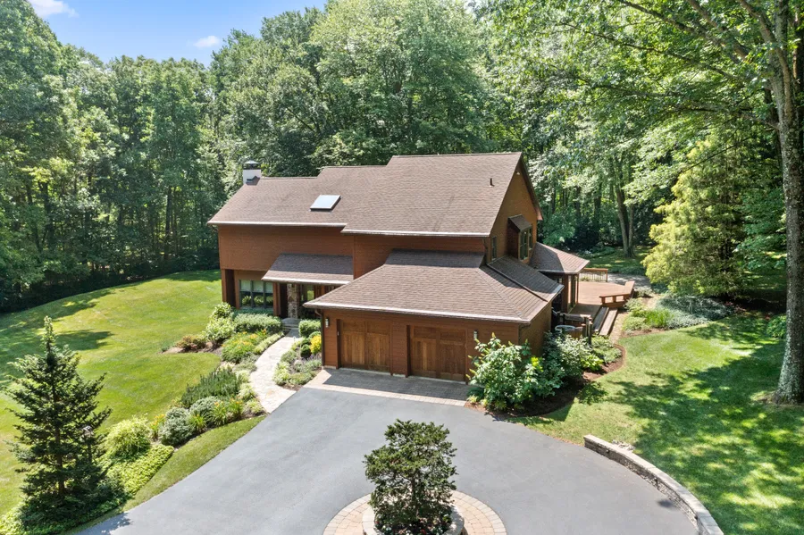 NEW PRICE! Exquisite custom-built contemporary home nestled on 5.7 acres of serene and private land in the prestigious Radnor Hunt country. Beyond the gated entrance, a picturesque lane winds through lush landscaping, manicured lawns, and enchanting gardens, culminating in a circular driveway and a captivating stone-front home. As you step inside, a grand two-story foyer bathed in natural light from skylights extends a warm and inviting greeting. The living room, adorned with a striking stone fireplace, cozy window seats, and a sliding glass door opening to a delightful deck, offers an ideal space for indoor-outdoor living. Throughout the residence, stunning teak hardwood floors exude elegance and charm. An elegant formal dining room with a tray ceiling and recessed lighting seamlessly connects the living room, family room, and kitchen, creating a seamless flow for entertaining. The open-concept family room and kitchen boast a soaring vaulted ceiling with exposed wood beams, a two-story fireplace, a breakfast area, and a central island, perfect for gathering and culinary endeavors. A convenient mudroom/pantry with abundant storage and an additional sink lead to the attached two-car garage, providing practicality and organization. Ascending to the second floor, you'll discover a luxurious primary suite featuring a dressing area, a walk-in closet, and a spacious bath adorned with a generous shower and a soothing soaking tub. Begin your mornings with a cup of coffee on the private deck off the primary suite, reveling in the scenic views of lush landscapes and serene woodlands. The second floor also houses three additional bedrooms, a jack-and-jill bathroom, a hall bath, and a laundry room, ensuring comfort and convenience for all. Meticulously maintained, this exceptional home showcases an array of special features, including teak floors, skylights, intricate tile work, custom wood doors, and enchanting fireplaces. Spanning the rear and side of the house, a sprawling deck provides ample space for outdoor relaxation and entertainment, leading to a graceful blue stone patio, manicured lawns, and meticulously designed gardens. The property is adorned with spectacular woodland landscaping, creating a tranquil oasis for nature enthusiasts. Ideally situated in Malvern, this remarkable property enjoys the tranquility of a secluded lane while offering easy access to major routes, shopping destinations, renowned restaurants, and a plethora of amenities. Immerse yourself in the beauty and sophistication of this exceptional residence, where refined living and natural serenity converge in perfect harmony.