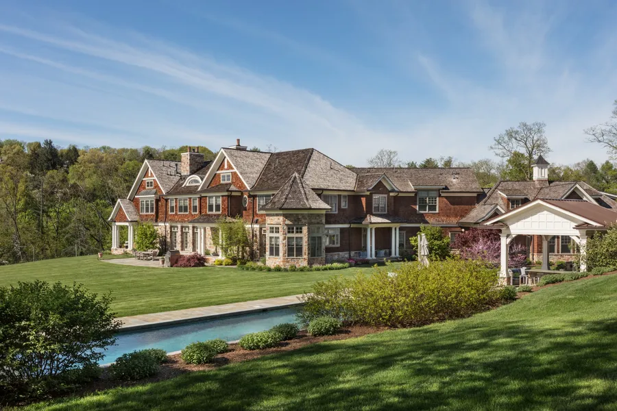 Designed in the noted Shingle Style that graces the famous summer mansions of Newport, the house has cupolas, turrets, gables, and dormers. The varied planes of the wood shingled roof complement the covered porches, stone loggias, and portico, adding up to a masterpiece deeply rooted in Americas architectural heritage.