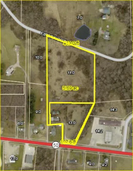 5.75 +/- partially wooded acres in 2 tracts that adjoin with frontage and access off of US hwy 50 that is zoned commercial and frontage on First North St zoned residential that would need to have a drive installed to access land. There is an older building on the commercial tract that was used for antiques and is in poor shape. There is an old mobile home on the residential tract that has not been occupied for sometime. City utilities
