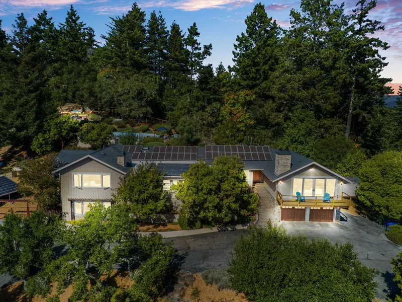 Panoramic Ocean Views from Santa Cruz to Monterey from this stunning hilltop home. As soon as you reach the top of Oak Acres you won't want to leave, but the views are just the beginning. Enter through the custom front door to high ceilings, an open floor plan and rooms with some of the most beautiful views in Santa Cruz. You'll enjoy the large 4 bedrooms, three with en-suite bathrooms, a stunning chef's kitchen with butler's pantry, refinished Cherry wood cabinets, 6-burner BlueStar oven/stove, Thermador hood, and skylight. Two large dining areas and large living room, laundry room and office all on the first level. Downstairs you'll find the large bonus space/den that is currently being used as a movie room and includes a kitchenette, bathroom and private entry great for guests or multi-generational living. This property has over 5 acres, but within the 2 fenced acres you'll enjoy a be...
