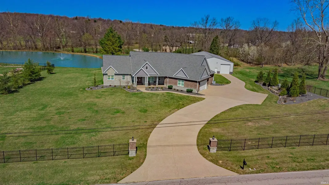 Own a magnificent, estate, custom built by Elpers Development, Inc., on 6 acres of pristine land, featuring a stocked lake for relaxation and recreation. This 3,700 sq. ft. home is crafted with excellence, offering energy-efficient insulated walls, solid wood doors, and elegant interiors with custom cabinets and hardwood floors. It includes 4 bedrooms, 4.5 baths, and a host of amenities like a den and living room with fireplaces, a modern kitchen with a wet bar, and a screened sunroom with a fireplac. The property also features a whole house generator and advanced security and camera systems. Enjoy a versatile 50 x 88 ft. insulated and heated pole barn, complete with a party room, full bath, storage, and a commercial kitchen setup. This estate blends luxury, comfort, and nature, offering a rare lifestyle opportunity.