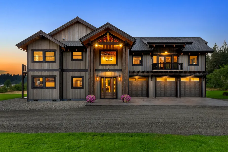 Light-filled rustic contemporary home! Newly built by DC Builders, pinnacle of heavy timber structures, offers this stunning Estate on 5.95 acres. Open floor plan with high-end finishes. 2-story tall grand foyer with heavy timber ceiling & floating staircase. Kitchen with large Island and Thermador appliances. Primary suite boasts 16' ceilings & private 10'x32' deck. Massive bonus room with deck. Each of 3 upstairs bedrooms has full ensuite bath. 30'x36' barn & detached 1,200 sq ft guest quarters! Fully fenced and gated.