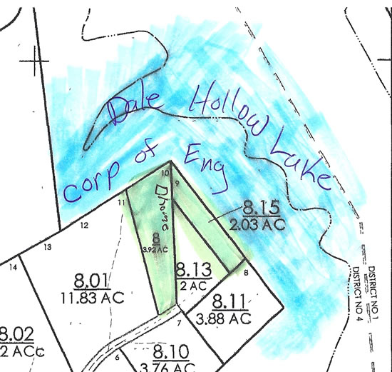 Approx 5.95 ac with a view of Dale Hollow Lake included is a 2 story wood Cypress siding home with 3BD/2BA, approx 2008 sq ft, built in 2002 and a full unfinished basement (has potential to be finished high ceilings, plumbed in for an additional bath, French doors for an easy private access) joining the Corp of Eng of Dale Hollow Lake (over 500 feet). Home is nestled in a wooded setting at the end of the road for a private and secluded setting. Home has 17ft vaulted ceilings, lovely TN stone fireplace with a wood mantel, and large breakfast bar with an open concept living dining and kitchen. Loads of closet and storage areas. Large open covered front porch and an upper and lower back deck with the main 8X34 covered and screened in deck off of the main level with French doors from the kitchen and master bedroom. A gentle walk to the lake form the property with no bluff or drop off. No H...