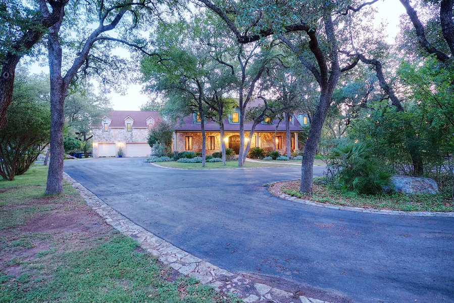 This property is a picturesque, 5-acre gated, private estate with a stunning custom home, pool with stone patio, equestrian barn with guest house, and manicured grounds with amazing mature oaks interspersed throughout. Walking around the manicured grounds you come across garden areas, creeks, stone installations, and gazebos through shade of magnificent trees. The main estate home offers 5,000 +/- sq ft of livable space and exquisite craftsmanship. The gourmet kitchen opens to a large living area with incredible stone fireplace, that is bordered by windows leading to a covered porch area. The kitchen features a basin sink, stainless appliances, breakfast bar, and amazing hand carved cabinetry. In fact, throughout the home the ambiance is enhanced by a wealth of hand-carved doors, cabinets, and other tasteful artistic flourishes.