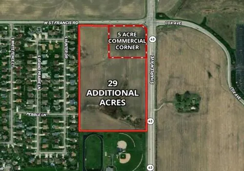 5 acre commercial parcel at the signalized corner of S. Harlem Avenue and St. Francis Rd in Frankfort, IL. The site has several potential uses. Owners split off this five acre commercial corner with the balance (29 acres) as potential residential use. Utilities are available from the Village of Frankfort. Will County has the zoning authority for this parcel. Very good traffic counts (with 2019 counts at 16,200 cars per day on Harlem plus 6200 cars per day on St. Francis Rd.) and excellent exposure for any type of development. 2.1 miles south I-80.