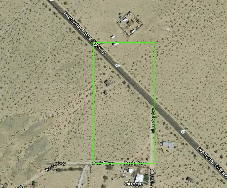 Outstanding parcel located right on California State Highway 62, in the western portion of the Wonder Valley area, in Twentynine Palms, California 92277. This parcel is located about 2.5 miles east of the Twentynine Palms airport. Highway 62 crosses through the property diagonally, creating a lengthy double frontage on both sides of the Highway. This may be a great future commercial property. Oleander Ave is located along the east boundary of the parcel and intersects with Highway 62. Existing homes are located directly adjacent to the property on the north, south, and east sides. BLM land is directly adjacent on the west side. This is a developing neighborhood.