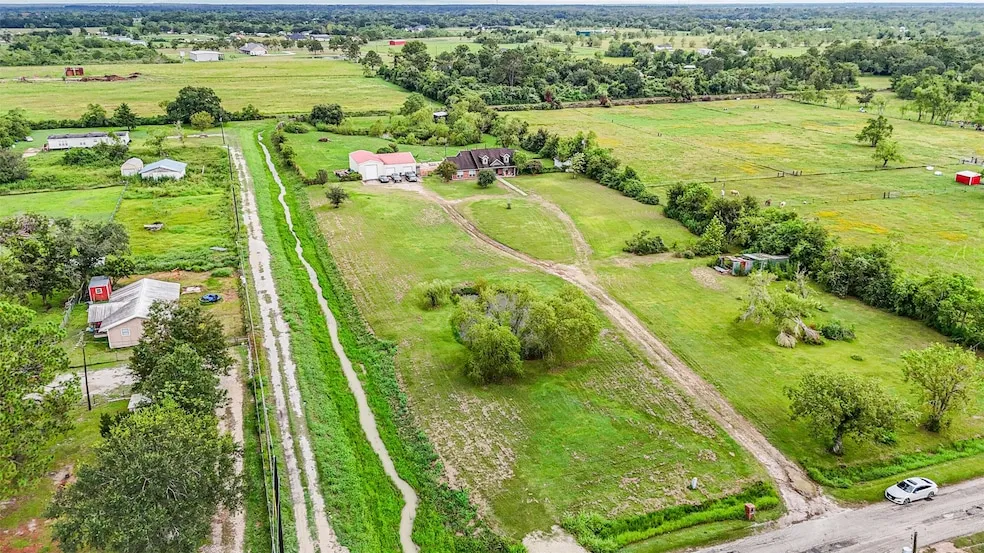 MUST SEE IN ALVIN!! 5-acre unrestricted property. The beautiful one-story brick home features four spacious bedrooms and two and a half baths, including a sizeable primary suite, split floor plan, open kitchen with oversized island, and abundant storage. Enjoy low energy bills with the 47 solar panels. The backyard has a sparkling swimming pool, barn, and pond. The large shop features multiple bay doors, a half bath, and several spaces to park vehicles and store your RV. Scheduling your showing today!!!