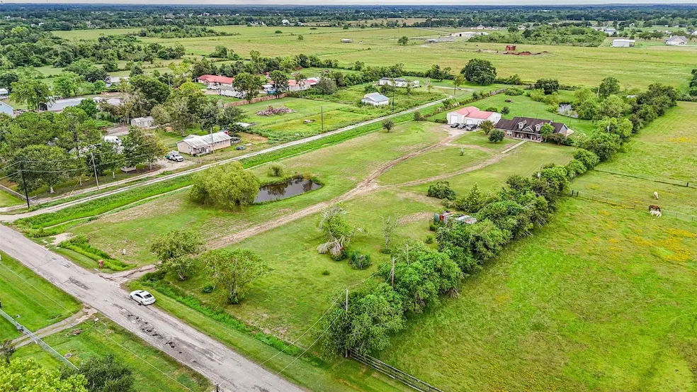 MUST SEE IN ALVIN!! 5-acre unrestricted property. The beautiful one-story brick home features four spacious bedrooms and two and a half baths, including a sizeable primary suite, split floor plan, open kitchen with oversized island, and abundant storage. Enjoy low energy bills with the 47 solar panels. The backyard has a sparkling swimming pool, barn, and pond. The large shop features multiple bay doors, a half bath, and several spaces to park vehicles and store your RV. Scheduling your showing today!!!