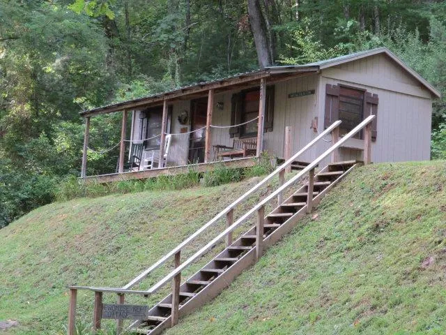 Selling this 5 wooded acres of waterfront land on Big Reed Island Creek and including a very nice, rustic, cozy, comfortable, immaculate clean, cabin built in 2001, with covered front porch overlooking Big Reed Island Creek. Cabin has power, 1 toilet/pedestal sink bathroom, 2 rooms that serve as bedrooms (no closets), good size open floor plan w/eat in area and living room. Home is served by gravity fed spring water from a collection tank on top of the land & has an 800 gallon septic holding tank (no lines) that sellers state they simply have pumped every few years for a cost of about $200. Up the Creek community is a recreational fun get-a-way mountain retreat for those that seek trout fishing, canoeing, kayaking, tubing on Big Reed Island creek, yet own your own land w/a simple cabin where everyone wants to gather for good times. This is waterfront land for sale & just happens to have this great little cabin on it. Cabin is being sold as is, yet quite comfortable as it is.