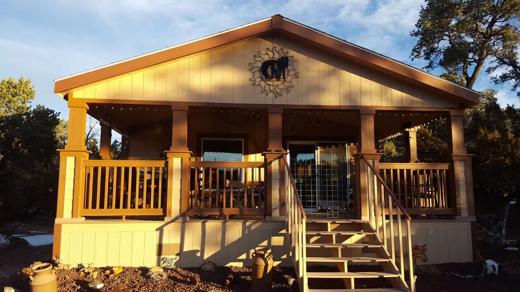 Home is 2 bedroom, 2 full bath, with storage/mudroom, large deck/covered porch (12x24) Trex floor (no maintenance) Wood burning fireplace Water haul trailer conveys, community well. Awesome views of Mesa, privacy. Additional 5 acre lot available. Financing contact available.