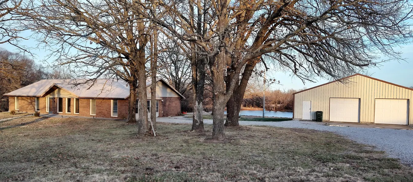LOOK HERE! WOW, a 3 bedroom, 2 bath home on 5 acres. outside of city limits with a 40 x 60 garage/shop with 220 electric. A private stocked pond with a panoramic view. Check out the beautiful flooring, a game room, family room, and living room in this spacious 2500 square foot home. The property is located in the Sandstone Hills Division and does have some restrictions (Se Declaration of Restrictions). Do not hesitate to take a look at this one. It might just fit your dream home expectations.