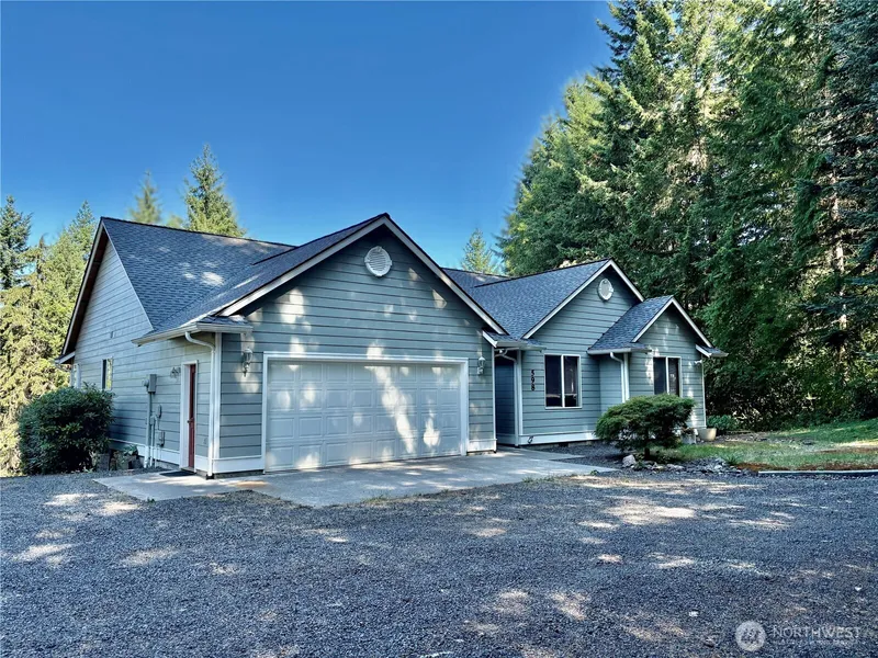 Beautiful 5 acre wooded setting! Well cared for one level home offers the ideal combination of comfort & functionality. The home features primary bedroom w/ full bath & walk in closet, 2 additional bedrooms & full bath. New roof installed, open concept layout for easy living. Kitchen with plenty of cabinetry, built in desk area, island w/seating & dining area. Nice hardwood floors, living room w/free-standing wood stove & heat pump. Generous deck, perfect for relaxing or entertaining, mature landscaping, double attached garage & secluded property. Enjoy the bonus of a large, detached shop, perfect for hobbies, storage, or workspace, plus covered RV parking. Great property & home, close in location. Truly a pleasure to view.