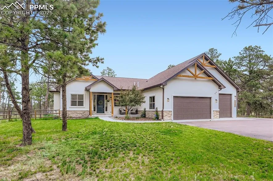 Tucked at the end of a quiet cul-de-sac in an exclusive eight-home subdivision in sought after Black Forest, this exceptional 5-bedroom, 4-bath residence offers the perfect blend of serene country living with city convenience. Perfect mix of mature ponderosa & meadow just minutes from Falcon shopping & enjoy easy commutes to both Colorado Springs & Denver. With over 4,300 square feet, this 2018-built home features an ideal layout for everyone & also multi-generational living, and those who love to entertain. Upon entry, you ll find a flexible front room perfect as a study, piano/music room, or formal sitting area. The spacious living room welcomes you with soaring vaulted ceilings, a gas fireplace, and rich scraped hardwood flooring that extends throughout the main living spaces. The gourmet kitchen is a showstopper, showcasing sleek cabinetry, granite countertops, and modern design elements. Adjacent to the kitchen, the main-level family room and laundry offer both function and style. The private primary retreat is a luxurious haven, complete with a well-appointed primary, five piece bath. On the opposite wing, two secondary bedrooms share a Jack-and-Jill bath each with private vanities offering an ideal setup for children, guests, or mother in law with bedroom/bath/study. Downstairs, the finished basement adds more living space, including 2 additional large bedrooms (one with its own en-suite full bath), home office, & a spacious family room & recreation space. Enjoy outdoor living from the covered deck, which overlooks the fenced yard surrounded by towering Ponderosa pines. The unique elevation of the lot ensures rear privacy no future neighbors behind you plus area for barn/shop. The garage is oversized with third bay with tall door for RVs. Additional highlights include paved roads within the subdivision, central air, versatile floorplan, granite/quartz and unmatched seclusion just minutes from city amenities. Rare opportunity to own a newer home in the trees.