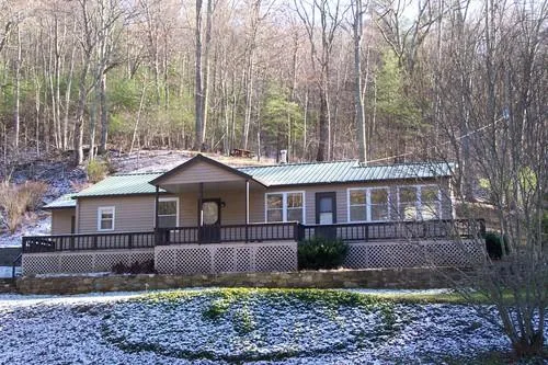 Enjoy total privacy from this 2 bedroom 2 full bath home with cedar siding, nice pond in the front, full length front porch, and 5 +/- acres of wooded and open land! Other features include newer den addition, replacement windows, stone hearth for a wood stove, nice rock work around the home, and lots of outbuildings including a large workshop! Located close to Independence and only minutes to the New River!