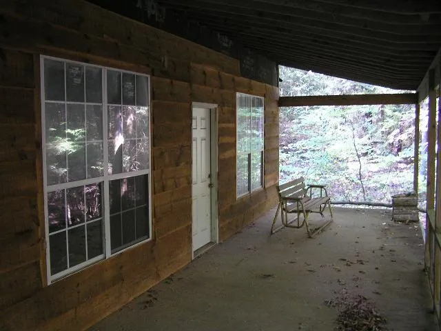 This is a large two bedroom cabin and the porch overlooks the creek. It is built in a Hemlock thicket and does not show up on the aerial photo's. It has kitchen two bedrooms and great room. There is a large amount of building materials to finish the outside and metal windows, pipe, bricks and all sorts of building material. No one has been ther for a while so it needs cleaned up but the roof and structure look good. You are at the end of the road by 900 acres of timber company property and Chickamauga Creek state park is just down the creek. A great getaway spot but you are 5 miles from power. It has furnature, wood stove, kitchen, and everything stays but the bear. They will owner finance for $5,000 down.