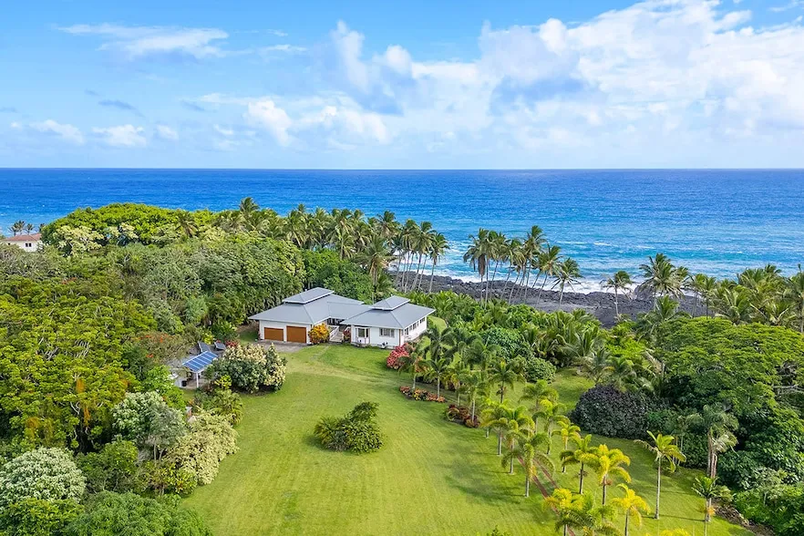 This stunning oceanfront home on 5+ acres in Pohoiki offers a rare opportunity to own a quality-built residence in a breathtaking, private setting. Originally designed by the master builder and lovingly maintained by the original owners, this home has been a cherished gathering place for family over the years. Whether as a private residence or a hosted vacation rental, this property offers unparalleled beauty and peacefulness, nestled in a lush tropical oasis on the spectacular East Hawaii coastline.The location inspires relaxation and rejuvenation, with easy access to breathtaking black sand beaches, the azure ocean, and lush tropical jungles. Whether you want to explore or simply unwind, this home is the perfect sanctuary for the mind, body, and spirit.Upon entering the property through a private gate, you'll be greeted by a mature orchard filled with Mango, Banana, Avocado, Ulu, Citrus, Macadamia, and more. The palm-lined driveway leads to a stunning home with breathtaking ocean views. The layout features two structures connected by a large, covered lanai, designed to maximize the enjoyment of ocean sights, sounds, and breezes. The main home includes an ocean-facing living area and large kitchen, plus a dining room and primary bedroom suite at the rear. The second home features a comfortable living area, kitchenette, and two bedrooms - one with incredible ocean views.Additional features include 10-foot ceilings with cupolas for airflow, oversized 816 sqft garage with boat/RV height door and separate laundry room, an oceanside 1,688 sqft tile sundeck, outdoor shower and soaking tub, and beautiful rock walls with steps leading to the coast. This off-grid property includes a cement catchment tank with UV water filtration, solar system, work shed, chicken coop, garden work area with compost bins, and more!A rare opportunity for sustainable living in a serene, secluded location. Experience Old Hawaii at its finest quiet, private, and away from it all.