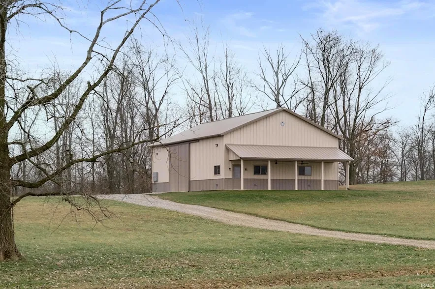 Built in 2024, this well-constructed 56 x 36 Morton pole barn is now available for purchase. The covered full-length front porch offers an ideal entrance or space to relax. The barn features durable metal siding, metal roof, and is resting on a concrete slab. The interior of the building is wide open and awaiting your final design / modifications. The barn features 400 AMP electrical service and has plumbing for a full bath already roughed-in. Gravel driveway is also already in place. With 5 acres of rolling lawn space and mature trees, this property offers both privacy and a peaceful setting. Located just outside Lewisville, Indiana, and south of historic US 40, it provides a desirable rural location with convenient access to highways. The land could offer the perfect space for future development as a potential residential home site (no HOA but covenants and restrictions are in place). Property is zoned agricultural (A-1).