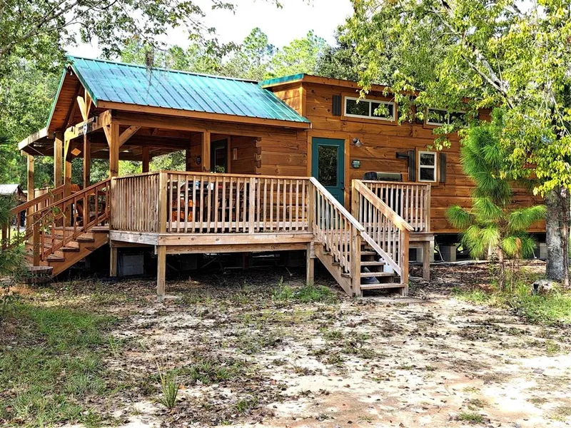 Enjoy your secluded ranch on 5 acres deep in the Florida Green Swamp, just 36 minutes from the gates of Disney, with a new 2022 log cabin mobile home that has the perfect deck wrapping the front and part of the side of the home for gatherings and reading a book on a lazy day(OUTDOOR PORCH FURNITURE INCLUDED). Meander down the dirt road that leads to your dream paradise and find an all new and FULLY FURNISHED oasis for you to unpack your clothes and food, and move right in! THE PERFECT BUG-OUT HEADQUARTERS!! Located off of Oil Well Road, this hidden gem backs up to acres and acres of unbuildable swamp land to ensure complete privacy!! The only signs of life are wild turkey, wild boar, plenty of deer, and other wildlife that call Central Florida home! This cozy cabin boasts a loft with large bed, with drawers in the stairs for extra storage! It has plenty of natural lighting, and 2 mini sp...