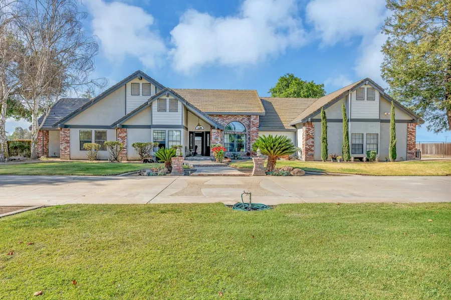 A true valley estate. The grand entrance leads you to this well appointed custom built home. 5 fully fenced acres perfect for entertainment. Bring the horses, bring the kids or grandkid's. Cool off in the in-ground swimming pool or warm up in the hot tub. Vaulted living room ceiling, Formal and informal dining, kitchen includes double ovens, and a restaurant style range with warming shelves, island, ample storage, pass through window/serving deck to backyard BBQ area, and open to dining/living space. Inside laundry room with deep soaking sink. Mature trees and drought resistant landscaping. Property is fully fenced with 8ft privacy fence for this park like setting, interior brick and iron fencing line the entry and driveway leading to a large 3 car garage.