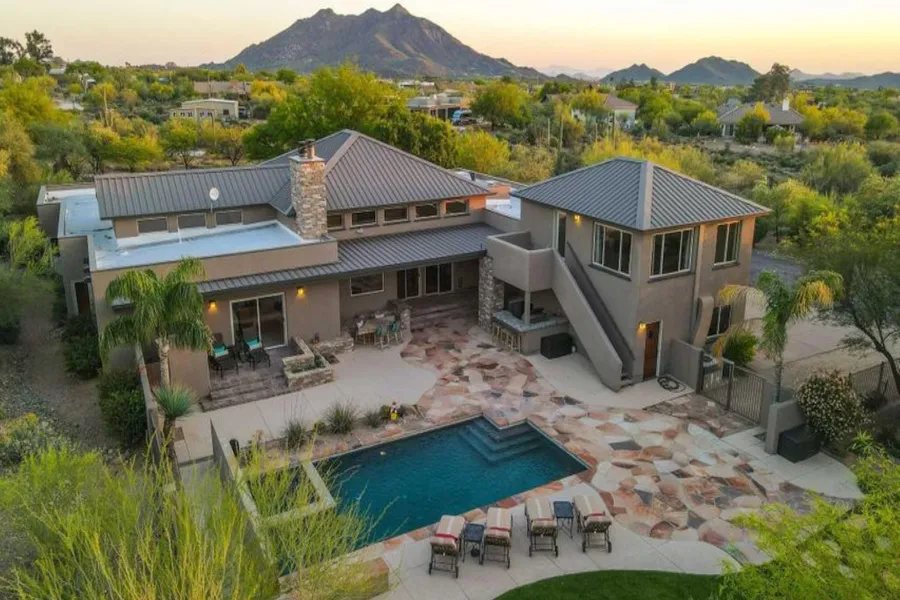 Elegant Equestrian Oasis makes the most of its stunning location in Cave Creek. Nestled at the end of a paved road & greeted by private entry gates, find a mature, lushly landscaped piece of paradise offering a garden oasis w/ privacy and panoramic mountain views. This custom ranch estate reflects Arizona's traditional architecture, greeting you w/ soaring wood clad ceilings, open concept, floor to ceiling windows drawing you through to views of the resort inspired backyard, including pool, spa, ramada, wood burning fireplace. High quality craftsmanship throughout w/ use of natural wood, native stone, stacked stone & flagstone. Magnificent fireplaces, Manganese ''chocolate'' Saltillo flooring & gourmet kitchen. Wonderful barn to match architecture of house w/ stucco, stacked stone, & flagstone. Structure can be maintained as existing barn or convert and/or add on for different use. Exist...