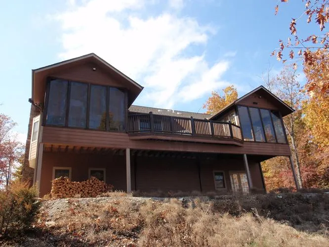 Near Bull Shoals lake, this attractive home has seasonal lake views, vaulted ceilings, red oak doors, a huge Great Room, heated/cooled sun room, spa, custom detailing. the buyer will also get a boat slip with a boat lift.
