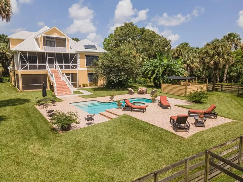 This beautiful plantation home sits 18 feet above sea level on 5 fully-fenced acres of tropical paradise, boasting hundreds of mature palm, oak and fruit trees. Breathtaking views from every room as well as from the 2 balconies and 3 screened patios which are perfect for entertaining, along with the exquisite pool and spa. This 4 BDRM, 3.5 BATH home has upgrades at every turn, including custom wood flooring, custom lighting fixtures, as well as crown molding everywhere and 8 ft. solid wood doors. Located in Martin County's award- winning school district. This home is situated in an unparalleled equestrian community. Close to all major highways. New water heater installed September 2020.