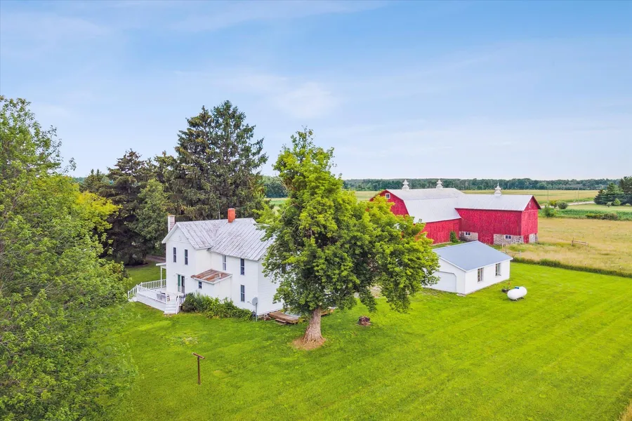 Welcome home to this absolutely charming updated four bedroom farmhouse sitting on 5 acres. The custom kitchen features quartz countertops and backsplash, an appx 9'x4' center island with barstool nook, built in electric cooktop, oven and microwave, backlit GE Caf refrigerator and vintage farmhouse sink. The main level also has a large open living room with pellet stove for extra heat, formal dining, laundry room, guest room and full bathroom. Upstairs you will find a sprawling primary suite, with walk in closet with shelving made from the homes original wood frame, a full bathroom and 2 additional bedrooms. Porches wrap this home on all four sides for endless views of wildlife and serenity even though its only 2 miles from US131. The barn is appx 96x36 with a 40x27 stall area, over 4,500 sq ft total, 2 hay lofts, and is equipped with water and electricity. The 4-place tandem garage with 3 overhead doors can store all your toys. This property is ready to be the hobby farm of your dreams, complete with chicken coop! Call today for your private showing.