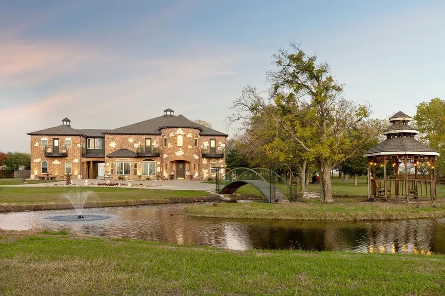 $20,000 TOWARDS RATE BUY DOWN WITH FULL PRICED OFFER! Escape to luxury on 5 acres with a picturesque landscape with abundant trees surrounding this property. Approach through a long winding driveway, graced with a porte-cochere, offering plenty of parking space. Enjoy watching the sunset from the incredible guitar-shaped pond, complete with an island & gazebo. Inside, discover exquisite design elements. It features several bonus spaces including a spacious media room, an office w- built-ins, a wet bar area with entertaining space, a solarium, & much more. 4 expansive bedrooms with walk-in closets, & 4.5 bathrooms. Enjoy scenic views from 5 balconies or unwind in the pool & spa on the large covered patio. 8-foot doors and a grand staircase exude sophistication. The property boasts a 2-story workshop with electricity, covered parking to the south for equipment, fully fenced grounds, & an electric gate for added security and convenience. Embrace a lifestyle of elegance and functionality.