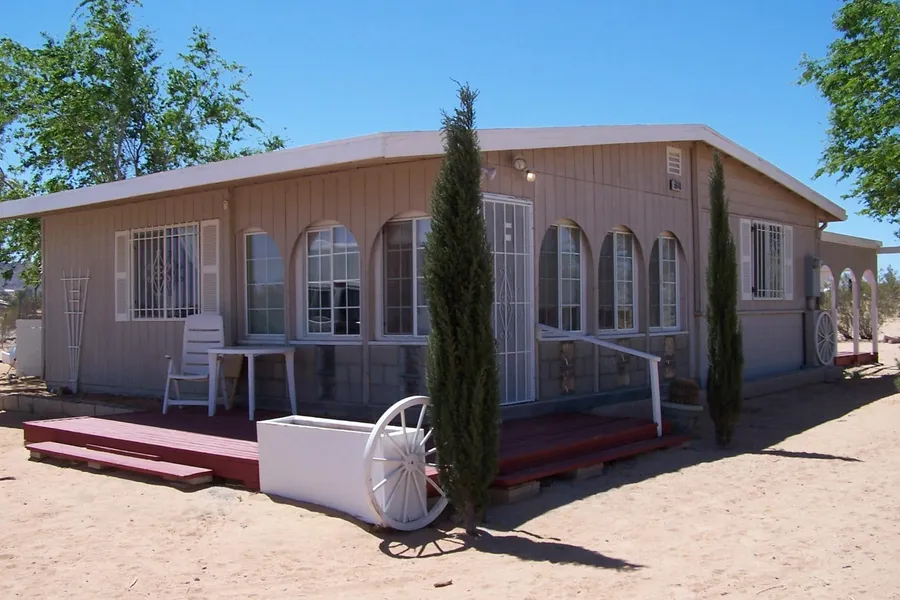 This is a lovely one bedroom, one bath home on 5 acres of land. The home has been remodeled, including the kitchen. The home is move in ready, clean a pretty as a picture. The porch has been enclosed to make a wonderful sun room. There are three decks for you to enjoy during he day and all the stars in the night sky. There is a large storage unit, RV dump and a dog run. The property is fenced all around the house with drive in double gates. There are lovely plants, mature trees and three apricot trees which bear fruit. The views are wonderful from here and it is about 15 minutes into downtown Yucca Valley. This one is a must see. Don't Wait - Call Now!!