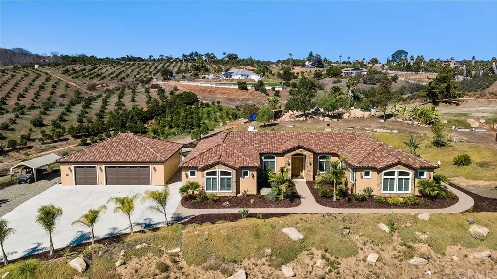 Welcome home to this single-level Mediterranean masterpiece! Perched high on the hillside, this one-of-a-kind custom estate exemplifies Bonsall's countryside living to its finest! The estate was thoughtfully designed for today's modern living with spaces to live, work, learn and play. The U-shaped layout lends itself to a functional lifestyle featuring a primary bedroom with a private entrance on one wing & a junior primary on the other. Custom luxury home features are brilliantly expressed through the 12-foot entryway, soaring ceilings, wide hallways, smooth walls, can lighting, granite countertops, travertine floors & custom hand-crafted walnut built-ins throughout. At the heart of the home is a spacious great room with a stone adorned fireplace. Exquisite materials & master craftsmanship blend harmoniously in the chef's kitchen w/ imported Italian granite countertops, Brazilian wood floors, hand-crafted walnut cabinetry, Bosch refrigerator, double ovens, two dishwashers, two sinks, an over-sized cooktop and a food warmer/bread proofer. Tucked into the right corner of the home is an impressive den & an adjoining flex room w/ its own entrance. Glass French doors welcome you into the den where the finely crafted custom built-in bookshelves take centerstage. At the end of the hallway is the primary bedroom w/ an additional bedroom along the way. The left wing of the home features a junior primary w/ an ensuite & two additional bedrooms that share the hall bathroom. Function meets design with thoughtfully planned utility rooms. The Pinterest-worthy mud room uniquely boasts a charming drinking water fountain and offers plenty of storage that is sure to keep you organized w/ built-in cabinets, cubbies, coat rack & walk-in pantry. Conveniently located off the kitchen is an oversized laundry room which houses a second refrigerator. Exceptional utility features have been built into this home including a central vacuum, a water softener, a whole house fan, plus an extensive PAID OFF solar system. The backyard is equipped w/ a play set, a basketball hoop, a large grassy area & a pad foundation w/ all utilities stubbed and ready for an outdoor kitchen. There's plenty of room for all your toys with the 6-car garage! The previous owner had water stubbed for an ADU at the corner of property. The property also has 2 fruit producing orchards & a fenced vegetable garden. If all of this wasn't enough, great schools & easy freeway access make this home an exceptional find!