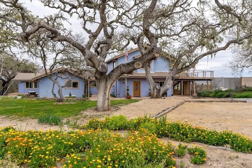 Discover the perfect blend of space, comfort, and breathtaking views in this sprawling 3,600 sq. ft., 3-bedroom, 3.5-bath home with a 380 sq. ft. ADU, all set on a stunning 5-acre parcel dotted with majestic oak trees. Ideally located in a coveted west-side setting on the east, just minutes from town, this property offers privacy without sacrificing convenience. Designed for the culinary enthusiast, the ultimate chef s kitchen features a double oven, a large center island with a Dacor 6-burner cooktop plus griddle and prep sink, an abundance of custom cabinetry, beautiful granite countertops, and plenty of pantry space. The spacious dining area, with vaulted wood ceilings and picture windows, creates a warm and inviting atmosphere, while the expansive living room boasts volume ceilings and a cozy wood-burning stove. A dedicated media/game room with a large screen and surround sound offers the perfect space for entertainment, and each of the three generous ensuites (2 on main floor) provides comfort and privacy. Beyond the home, the property is rich with amenities, including a gated entrance, perimeter fencing, a garden area with raised beds, 60+/- 'Luka' olive trees, multiple sheds/workshops, a basketball/sports court, covered RV parking with hookups, owned solar, and several decks ideal for entertaining or simply unwinding while taking in the incredible surroundings. This is a rare opportunity to own a private retreat with all the conveniences of town just minutes away!