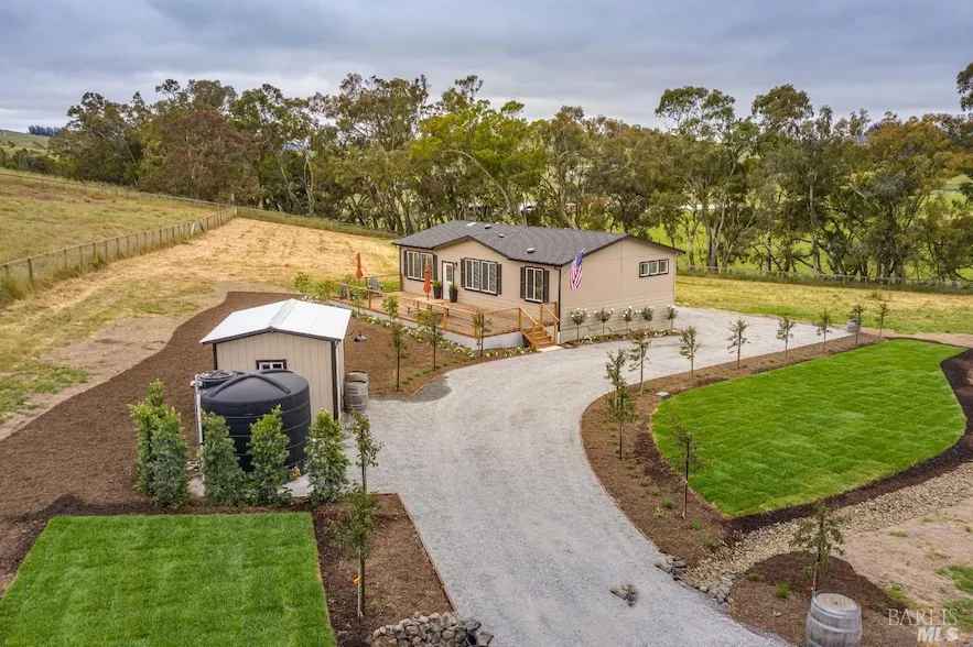 Serene West Petaluma country property located on 5 acres with views, at the end of a newer paved road (May 2020). Gorgeous 1,188 square foot, 3-bedroom, 2 bath single-story manufactured home completed in 2023. Plenty of space/septic and well capacity to build another home. Recently built (August 2021) two-stall horse barn plus tack room with full-length 12' overhang (generous 12'x16' stalls), new well completed in August 2021, drilled to 380 feet deep and yielding 8-10 gallons per minute. 5-bedroom septic system installed in 2022. Entire parcel with wood fencing around perimeter and cross-fenced, pasture, automatic entry gate, utility carport for farm equipment and plenty of space for RV parking. Enjoy outside entertaining on the large deck! Beautiful landscaping with lawn areas. In the center of the Petaluma GAP AVA, approved in 2017. Excellent region for growing Pinot Noir. Award-winning, highly rated and desirable Liberty School District. Surrounded by estate homes on acreage. A close drive to US 101 South and North. Close to downtown, shopping, wineries, and the beach, but away from the crowds. Beautiful sunsets in a peaceful country setting!