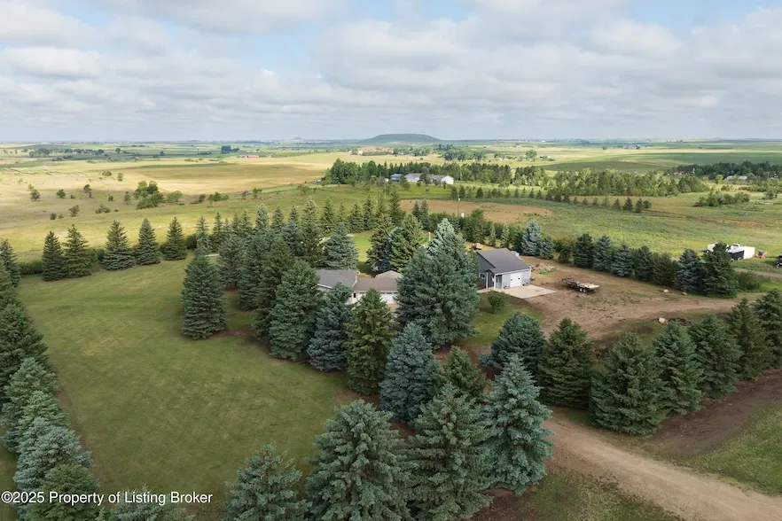 Immaculate 5 Acre Property with Shop & All the Classy Comforts in a Exquisite one-of-a-kind Home! Discover this beautifully updated & well-maintained rural property offering @3,744 sq. ft. of thoughtfully designed living space! Property is fully fenced & located just minutes NE of Dickinson. Four bedrooms (one non-conforming) & 3.5 baths, with a luxurious primary suite showcasing a tray ceiling, garden tub, & an abundance of windows. The formal dining room is grand & elegant perfect for entertaining. The unique lay-out includes a two family/living rooms, a theater room & bar area. The heart of the home is the gourmet kitchen with a massive island, a coffee nook with a 2nd sink, quartz countertop, soft-close custom cabinetry & pantry. Step out onto a roomy private deck & enjoy the sunsets! This home is super-efficient with an average Roughrider Electric bill of just $160/month and supported by Southwest Water. The exterior is seamless steel siding, class 4 shingles just a few years old, and newer Anderson windows for worry-free living. Two split units and an Central Air Unit, forced air with heat pump and a gas fireplace ensure year-round comfort, while heated tile floors add a cozy touch. Sale includes all appliances, including the washer and dryer nestled into the dedicated laundry room. The three-stall garage includes a double deep stall to suite 4 vehicles comfortably. The 24x44 heated shop (tubing installed, heat ready to be hooked up) features a steel roof, 200-amp panel, septic line to outbuildings, and is roughed in for a 3 4 bath. A Shed, 500-gallon propane tank, basketball hoop, camper power station, and two bright LED yard lights complete this versatile acreage. Set among mature evergreens and bushes, this property blends efficiency, elegance, and room to live and work! This one is truly a must-see!