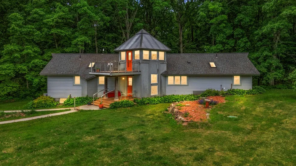 The custom-designed and built home is ready for its next artist in residence or someone looking for a personal retreat from the everyday. Chosen by the original designer/builder for its location among nature to inspire creativity, this home features an open living space with a soaring cathedral ceiling, a loft opening to a second-story balcony, and two outbuildings, each with their own studio space for a wellness center or creative studio. Three bedrooms on the main floor of the home offer their own view of nature, with the main bedroom doorwall opening to its own portion of the deck. The main bedroom and ensuite bath also feature custom built-in drawers, a vanity, a skylight over the shower, and a spacious walk-in closet. The current library/study is the third bedroom. The home has a full basement with a walk-up exit. Laundry is on the main floor.